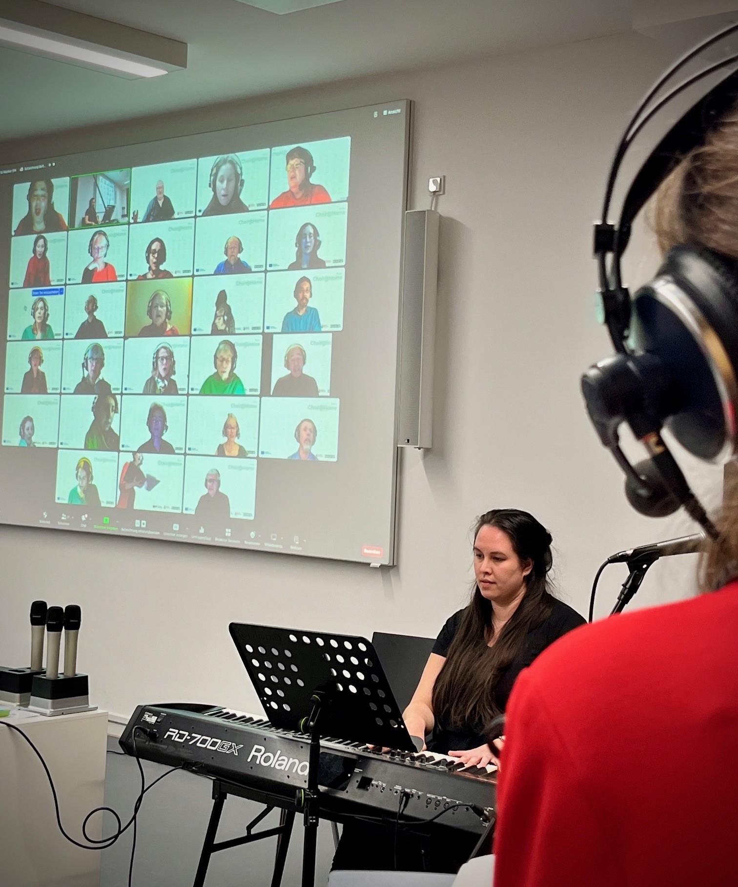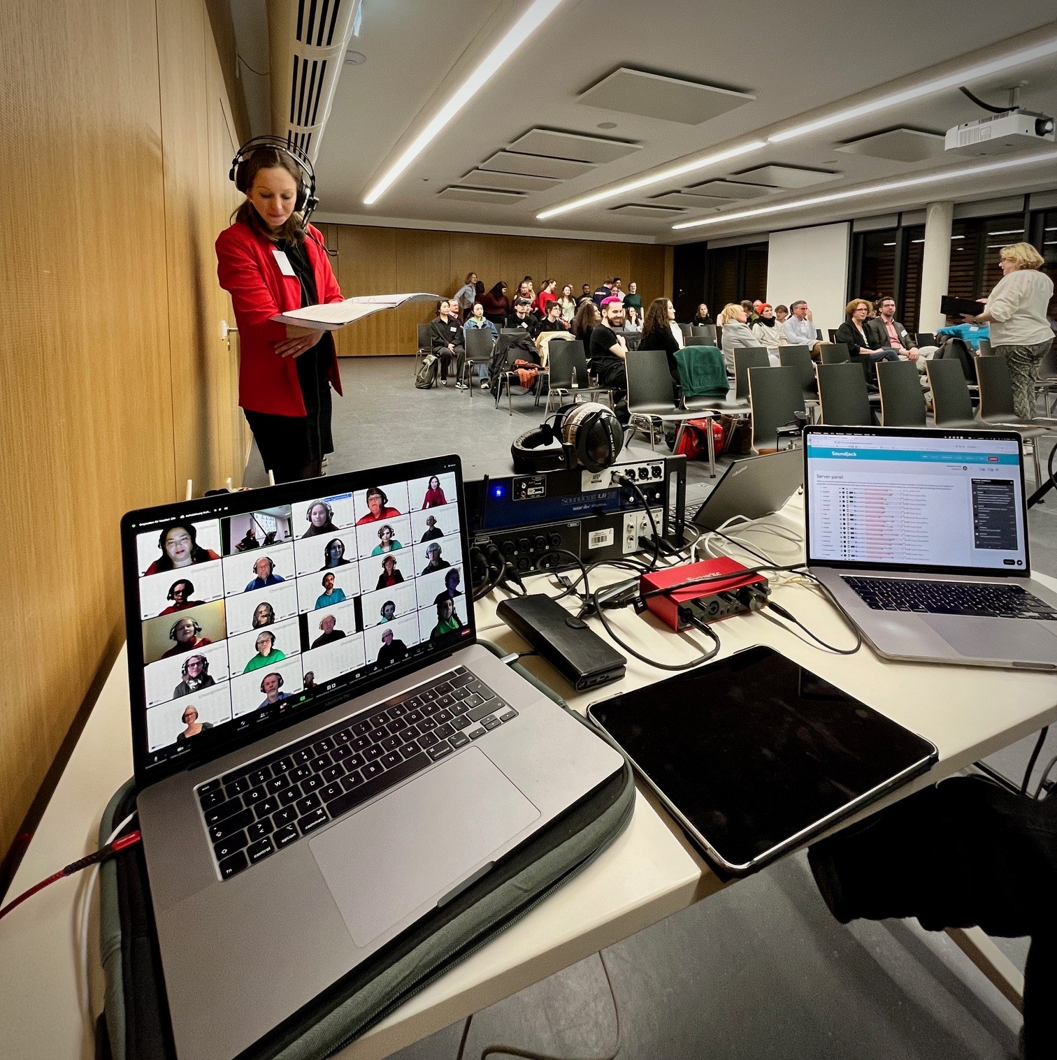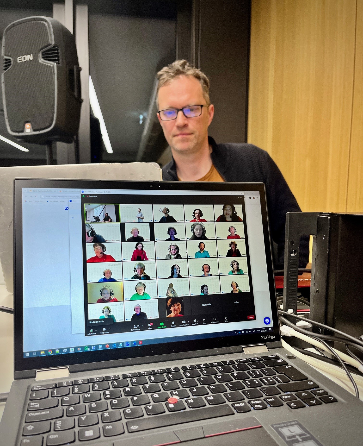 The project team is proud to have successfully mastered the experiment and extends heartfelt thanks and congratulations to our choir! They embraced the challenge of live performance and excelled at it. While the pianist was present in Munich, the sound of her e-piano was synchronized online with the channels of the individual singers and output as a unified sound. This meant a particular technical challenge for the pianist Alexandra Milborn, who had to stay a step ahead of the singing, but also for the choir director Markus Rohregger. For him, it meant leaning back during the performance and enjoying the results of the intense preparations, as direct choreographic input was at this stage no longer possible.