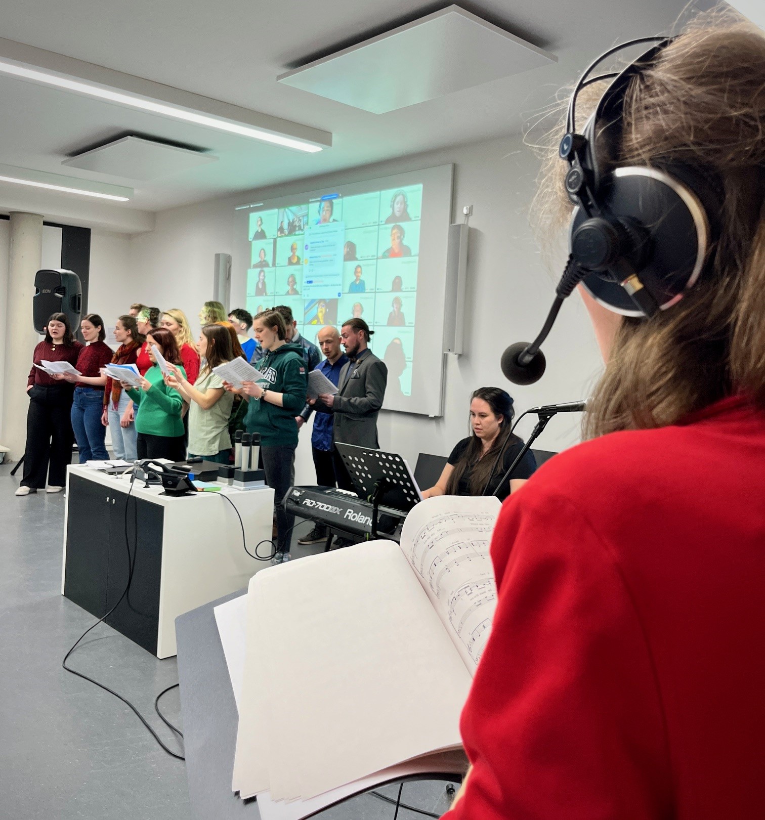 Texts and intonation were learned, rehearsed in voice groups, and coordinated in the entire choir. In six intense rehearsals, the nuances were fine-tuned and coordinated with the pianist – not in person as is usual for a choir, but online using the ultra-low latency software Soundjack. This innovative approach was the central task of our laboratory choir within the framework of the cooperative Erasmus project Choir@Home, implemented in collaboration with the Mozarteum Salzburg in Innsbruck, and the University of Liechtenstein and the University of Applied Sciences Anhalt.